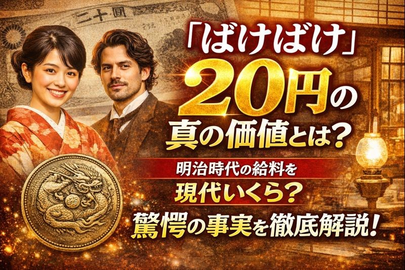 明治時代の1円は、いろんな資料(日本銀行とか)で約3〜4万円の価値ってされてて、20円はざっくり70〜80万円レベルになるんだ。