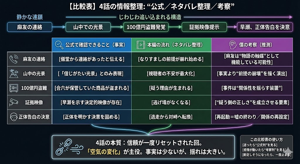 - 【比較表】4話の情報を“公式/ネタバレ整理/考察”で一枚にまとめる