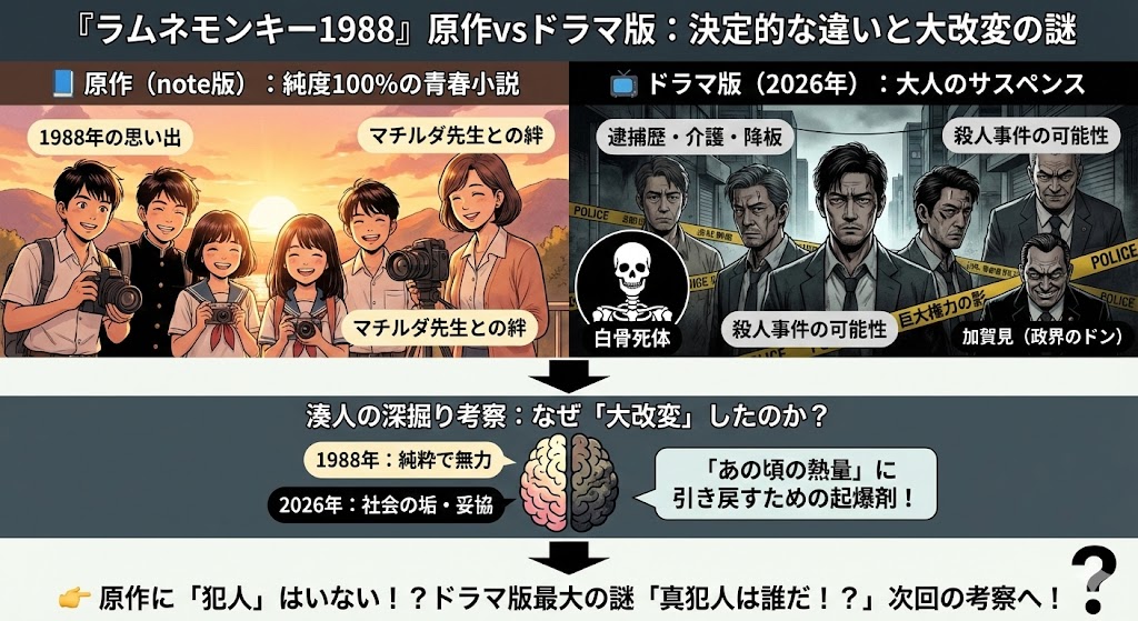 | 比較ポイント | 📺 ドラマ版(2026年) | 📘 原作(note版) |