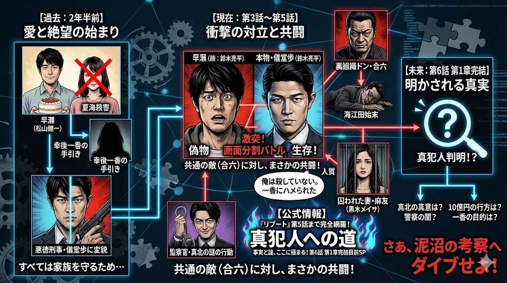 興奮冷めやらぬ最新第5話。ついに「早瀬」と「本物の儀堂」が直接対峙を果たしたね!鈴木亮平さんの画面分割による一人二役のバトル……瞬きするのも惜しいほどの極限の緊張感でした!そして、ここで明かされたのが、「儀堂は夏海を殺していない」という全てを覆す証言です。