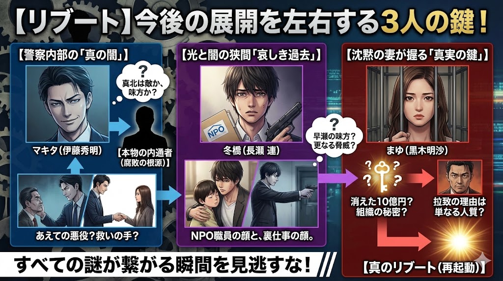 ここからは少し空気を変えまして。物語をさらに複雑で、かつ極上のエンタメに昇華させている「裏の顔を持つ人物たち」にフォーカスさせていただきます。検索窓で「リブート 伏線」「リブート 怪しい」と夜な夜な検索している皆さんのために、今後の展開を見極める上で絶対にマークすべき「警察内の内通者」「闇を抱えた青年」「沈黙する妻」の3つのポイントを、ドラマ評論家として鋭く解体いたします。