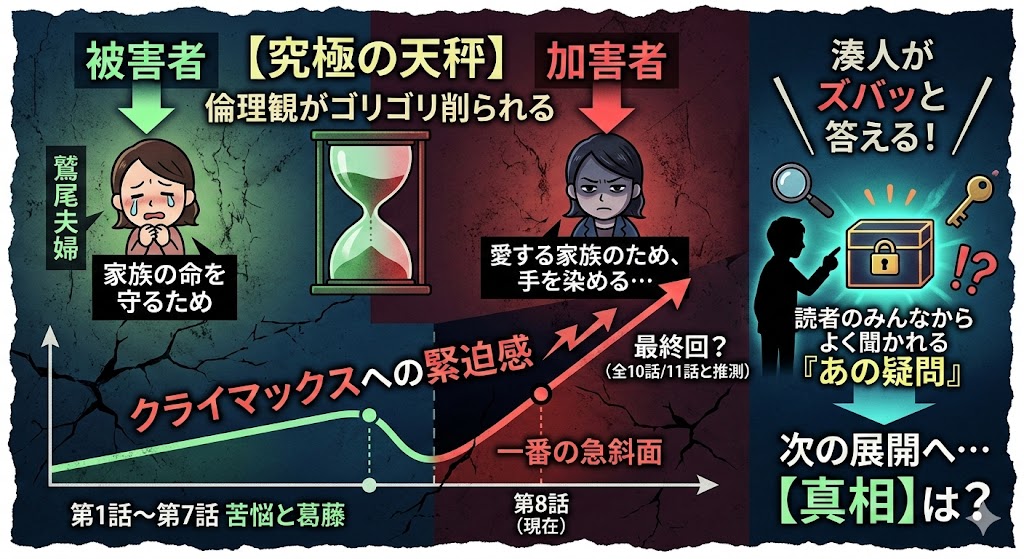 鷲尾わしお夫婦が追い詰められていく姿は、決して他人事じゃない。「もし自分だったらどうする?」と、テレビの前で僕たち自身の倫理観がゴリゴリ削られる。だからこそ、ここまで深く、痛いほど刺さるんですよね。