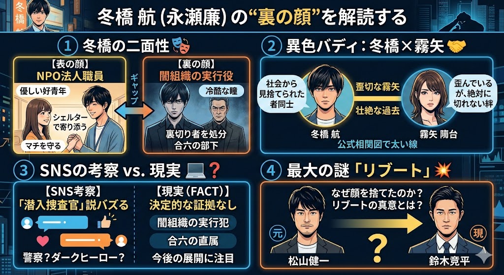 × | 【冬橋(永瀬廉)の二面性】 表 心優しいNPO職員 ↕ 裏 闇組織の冷酷な実行役 |