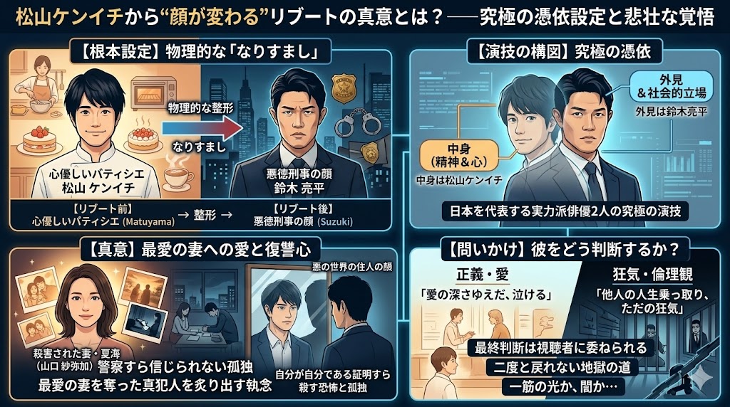 - 松山 ケンイチさんから顔が変わる意味:魔法なんかじゃない、「物理的ななりすまし」。愛する者を奪われた、あまりにも悲しく狂気的な復讐の証です。
