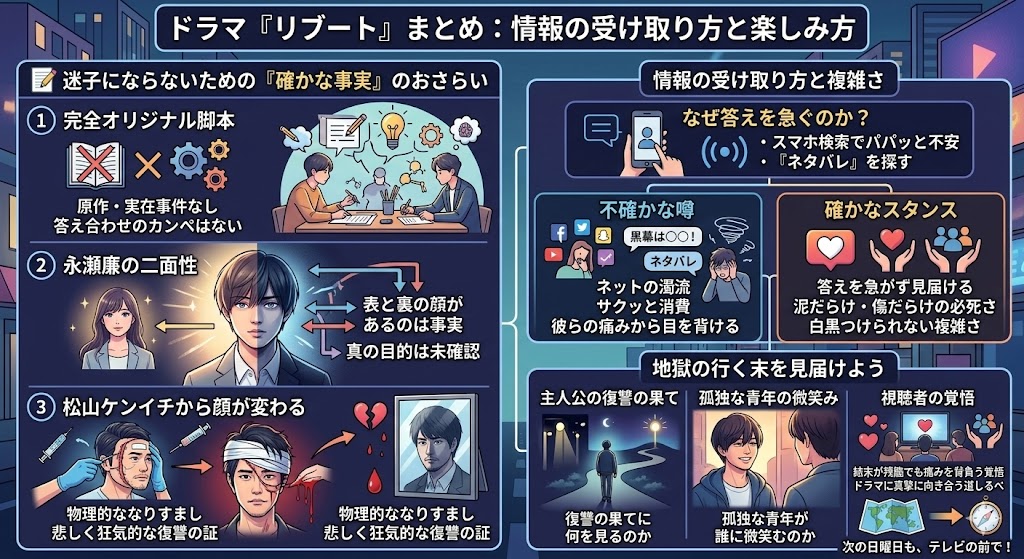 この重厚で悲しい物語をどう受け止めるか。最終的な判断は読む方それぞれですが、この記事が、皆さんが『リブート』という極上のエンタメに、もっと深く、もっと真摯に向き合うための「道しるべ」になれたなら……ドラマ見届け人として、これ以上の幸せはありません。