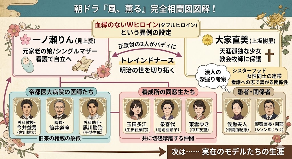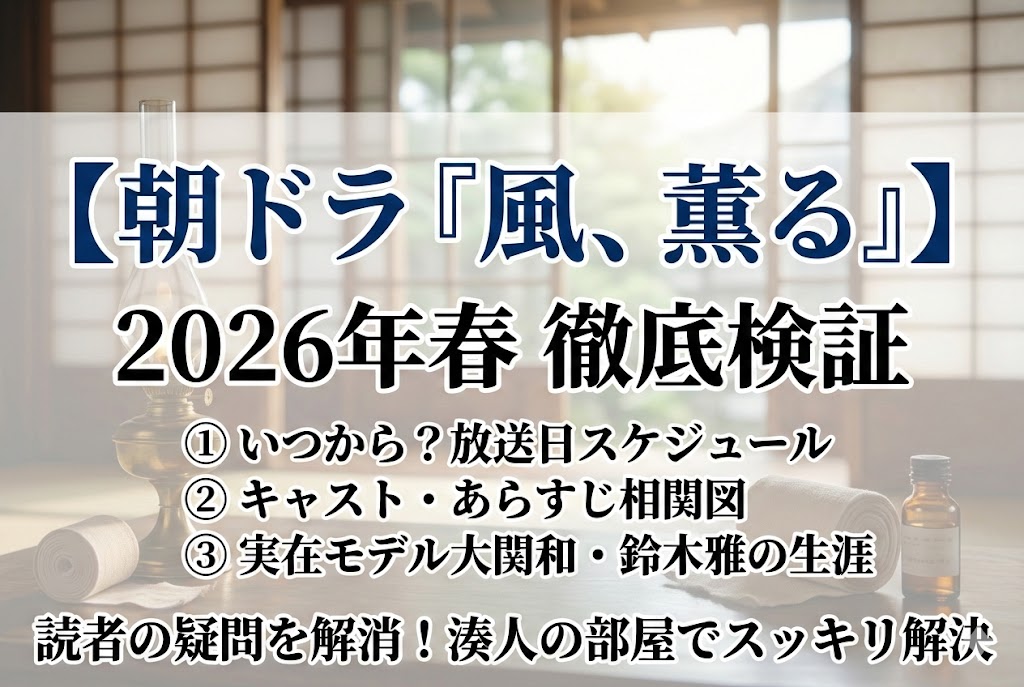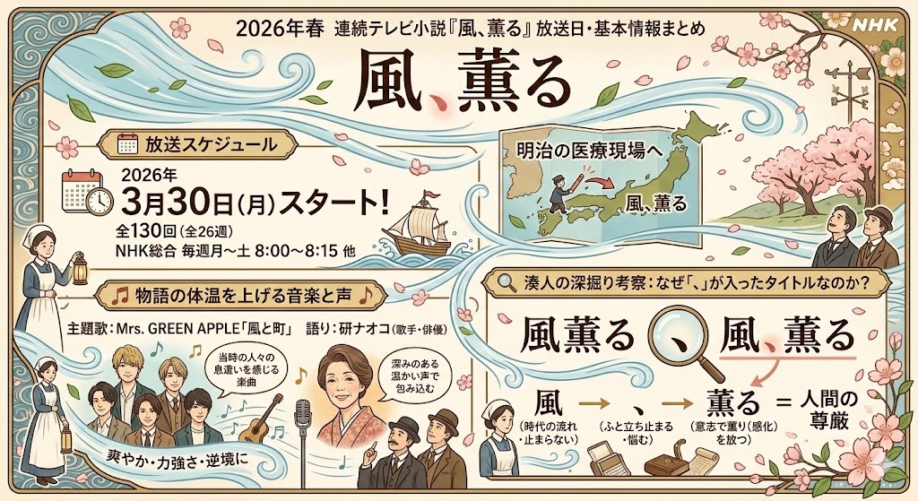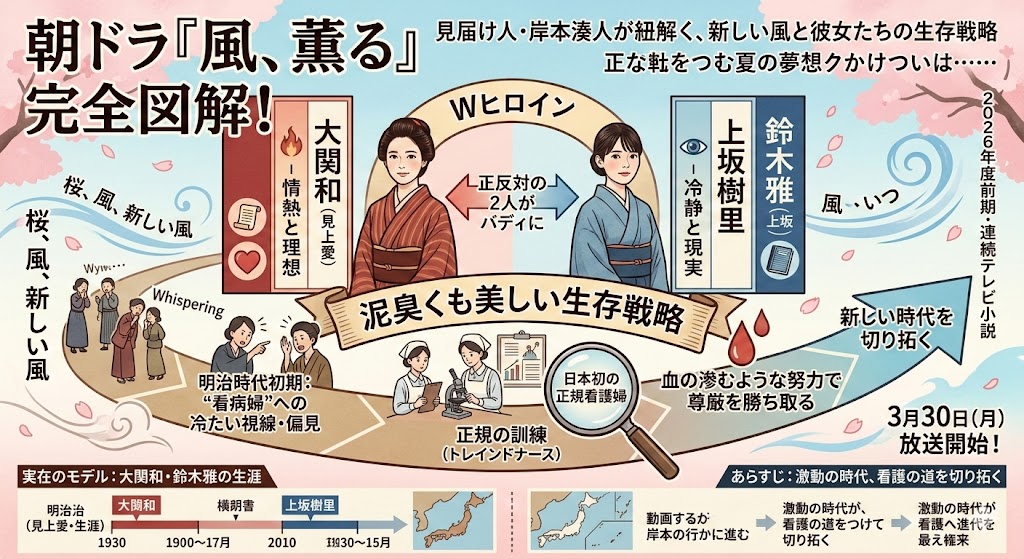 この記事では、入念な調査に基づく確かな最新情報だけを厳選し、ドラマ『風、薫る』のキャスト、あらすじ、そして実在したモデルの生涯を、図解を交えながら視覚的にもわかりやすく紐解いていきます。