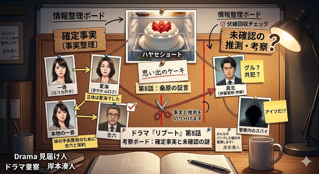 早瀬はやせに鋭く問い詰められて、恐怖と罪悪感に震えながら自白した彼女の言葉で、夏海なつみ一香いちかの顔に整形した(リブートした)」って事実が100%裏付けられたよね。状況証拠だけじゃなくて、第三者の明確な証言が加わったことで、このドラマ最大のミスリードが見事に回収されたわけだ。