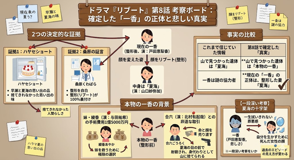 これ、言葉にするとすごく複雑で混乱しちゃうよね。要するに、夏海なつみ(演:山口紗弥加やまぐち さやか)が、本物の一香いちかの顔に「リブート(整形)」して、現在戸田恵梨香とだ えりかさんが演じている「一香いちか」として生きているってことなんだ。
