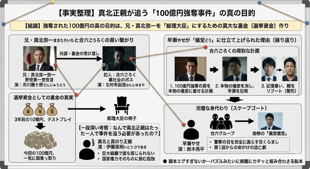要するに、僕たちが第1話からずっとハラハラしながら見守ってきた早瀬はやせの命がけの逃亡劇は、すべて真北弥一まきた やいちを総理大臣にするための、周到に計算された「目くらまし」の一部に過ぎなかったってこと。