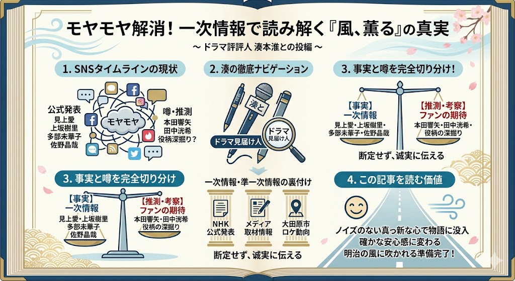 NHKの公式発表、信頼できる各メディアの取材情報、そして大田原市でのロケの動向。僕自身の足と目で裏付けを取り、少なくとも今わかっている範囲では、誰がどんな想いを背負ってこの物語に生きているのか。事実と推測を完全に切り分けて、わかりやすく紐解いていくよ。