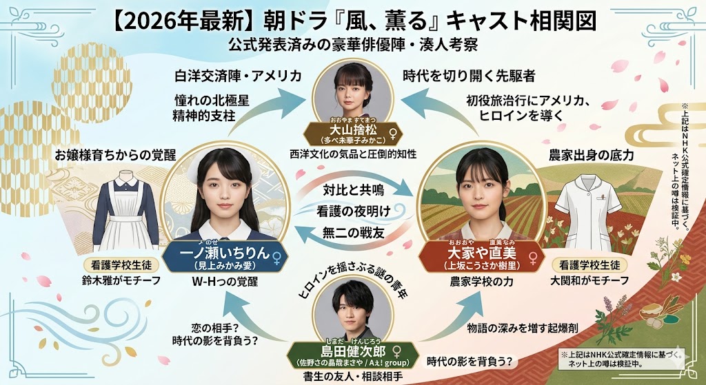 1. 【2026年最新】朝ドラ『風かぜ、薫かおる』キャスト相関図!公式発表済みの豪華俳優陣