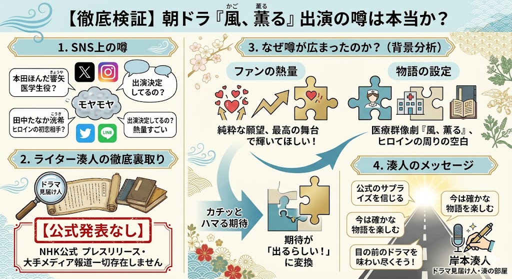 当サイト『ドラマ見届け人・湊の部屋』では、読者の皆様に誠実で正確な情報をお届けすることを何よりも大切にしております。本文中にも繰り返し明記いたしました通り、公式に発表されていないキャスティング情報や、ネット上の噂・推測につきましては、確定した事実と混同されることがないよう、明確に区別して記載しております。