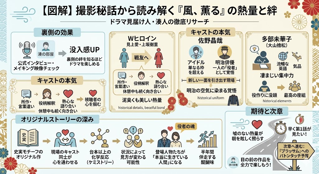 公式のレポートを読み解くと、Wヒロインを務める見上みかみあいさんと上坂こうさか樹里じゅりさんは、なんとカメラが回っていない休憩中も、当時の所作や言葉遣い、そしてお互いの役柄の解釈について熱心に語り合っているそうなんだ。