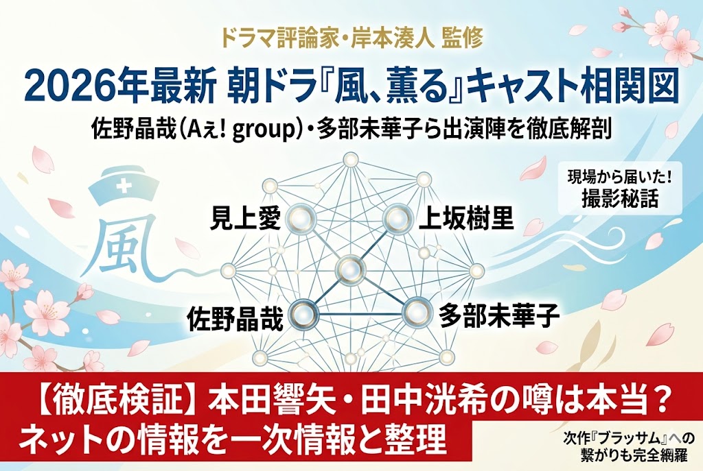 今回は、2026年3月30日にスタートする連続テレビ小説『かぜかおる』について、公式から発表されている確かなキャスト相関図から、ネットを賑わせている若手俳優たちの出演の噂、さらには次作へのバトンタッチまで、僕なりの視点と徹底的なリサーチをもとに整理してきました。