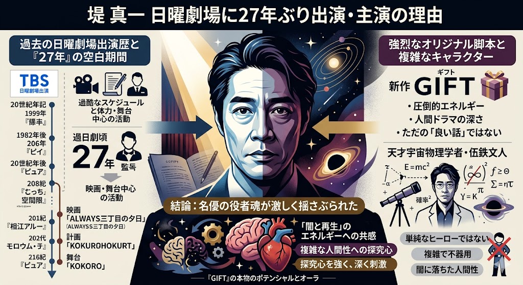 少なくとも今わかっている範囲では、堤さんの27年ぶりの帰還は、この『GIFT』という作品が持つ「本物」のポテンシャルを何よりも雄弁に物語っています。日曜の夜、画面越しにビリビリと伝わってくるであろうあの圧倒的なオーラを、僕たちもテレビの前で全力で受け止めようね!