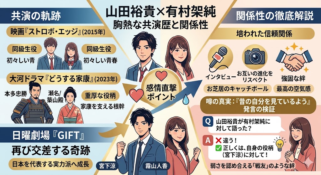 さて、ここで皆さんのモヤモヤを一つ、スッキリ解消しておきましょうか。ネット上で少しだけ情報が一人歩きして、「山田 裕貴やまだ ゆうきさんが有村 架純ありむら かすみさんのことを『昔の自分を見ているよう』と語った」なんて噂を見かけたこと、ありませんか?