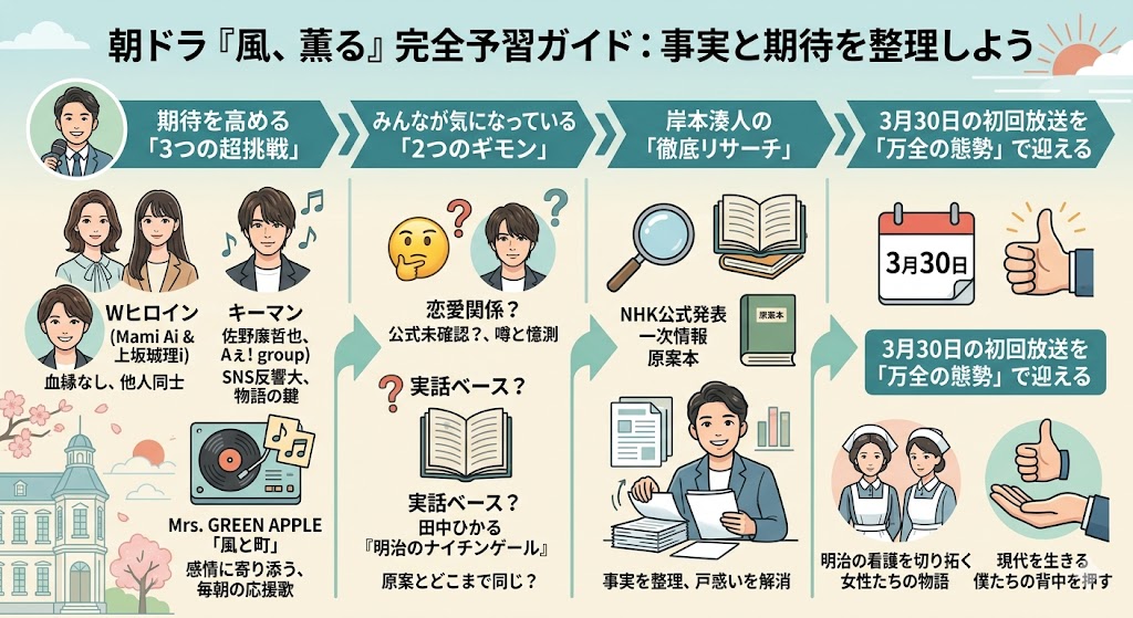 ここでは、僕が運営するブログやSNSにもよく寄せられる「放送直前のリアルな疑問」について、これまで何十作と朝ドラを見届けてきた経験と、公式の一次情報をもとにズバッとお答えしていきます。モヤモヤをスッキリさせて、最高の状態で第1話を迎えましょう!