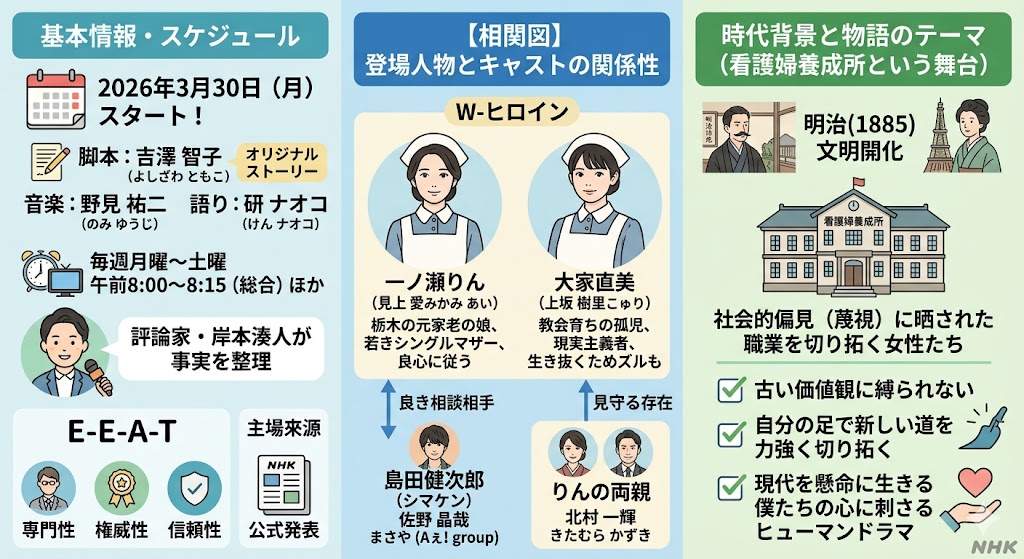 そこで今回は、ドラマの構造や背景を読み解くことを生業としている僕が、NHKの公式発表や信頼できる一次情報、さらに原案となった歴史的背景(『明治のナイチンゲール 大関和物語』)までを徹底的にリサーチしました。そして、現時点で判明している事実を「放送直前の完全予習ガイド」として、丁寧に整理してお届けします。