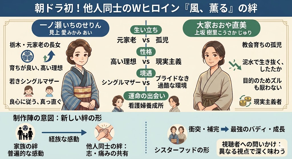 ネット上でも「なんで姉妹じゃないの?」「全く違う2人がどうやって出会うわけ?」なんて戸惑いの声がたくさん上がっているのも頷けます。ここでは、公式に発表されている2人のプロフィールを整理しつつ、長年ドラマの構造を分析してきた僕の視点で「なぜあえて他人同士なのか」という深い理由に迫っていきましょう。