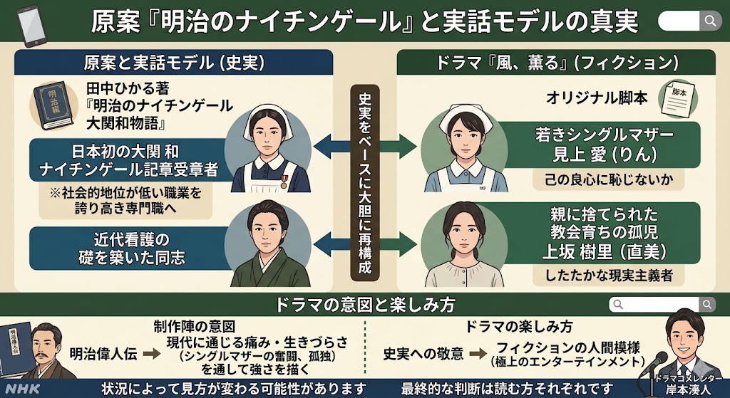 しかし、ここで一つ、皆さんに気をつけておいていただきたい重要なポイントがあります。それは、ドラマ『風、薫る』は、実話をそのまま忠実に映像化した「伝記」ではないということです。
