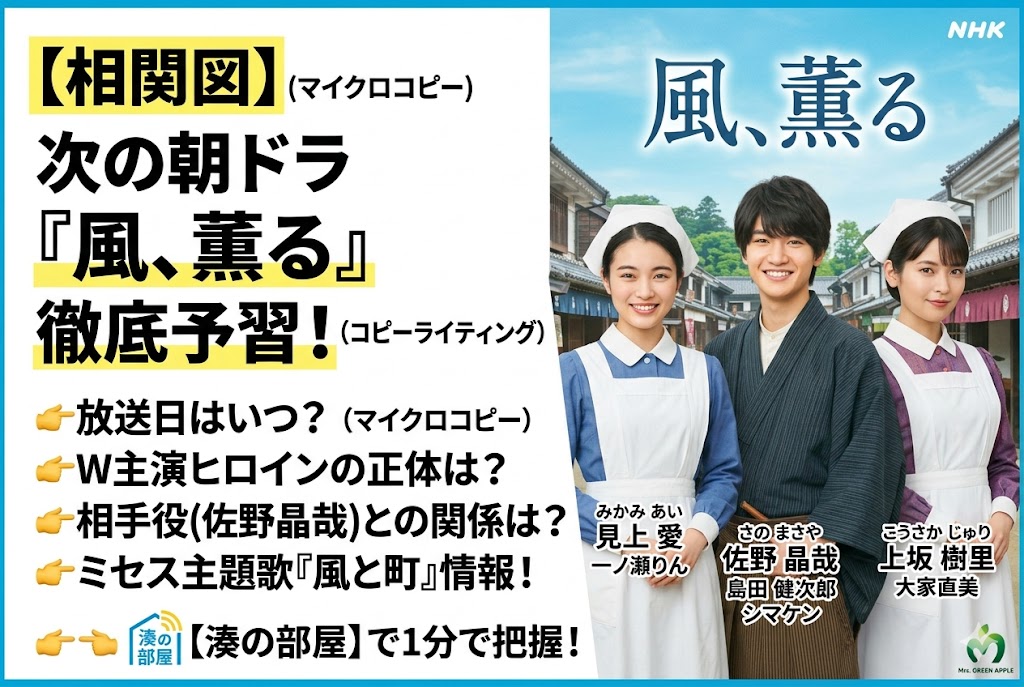 朝ドラ史上初となる「血縁関係のない他人同士のWヒロイン(見上愛さん・上坂樹里さん)」という異例の座組み。そして、SNSでも大きな反響を呼んでいるキーマン・佐野晶哉さん(Aぇ! group)のキャスティング。さらに、毎朝の感情を優しく包み込んでくれるであろうMrs. GREEN APPLEの主題歌「風と町」。