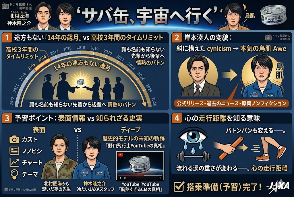 本記事は2026年3月末現在(放送前)の公式発表、および原案となった史実(福井県立若狭高校の宇宙日本食開発プロジェクト)の徹底的なリサーチに基づく予習・考察記事です。事実誤認のないよう細心の注意を払って執筆しておりますが、万が一誤りがあった場合は速やかに訂正いたします。