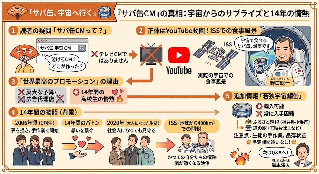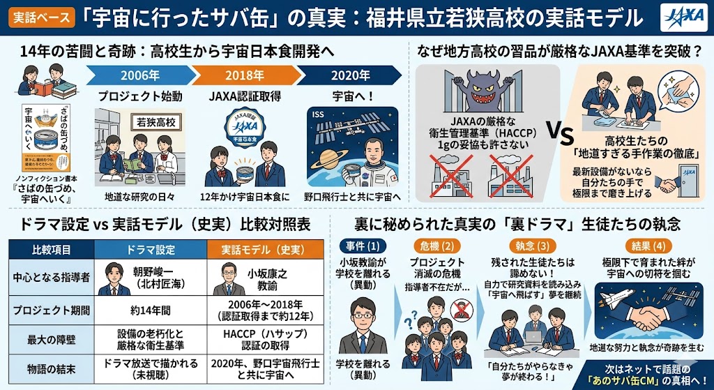 放送を前にして、多くの方が一番気になっているのは「結局、どんなストーリーで、誰がどう絡んでくるのか?」という全体像ではないでしょうか。結論からお伝えしましょう。本作は、「14年という途方もない歳月をかけ、福井の高校生たちがJAXAの厳格な審査(HACCP)をクリアし、自作のサバ缶を宇宙へ届ける群像劇」です。