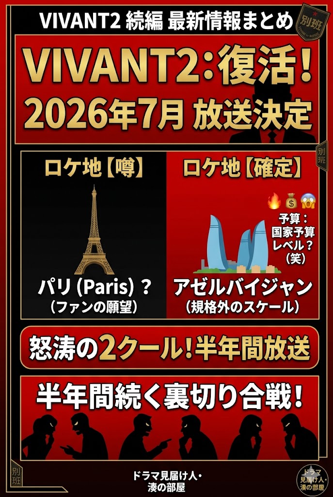 この記事では、一人のVIVANT狂である僕(岸本湊人)が、ファンの願望が詰まったパリ説への愛あるツッコミから、確定情報であるアゼルバイジャンでのロケ地考察、そして半年間続く裏切り合戦を生き抜くための秘策まで、最新情報とあふれる熱量でお届けします。