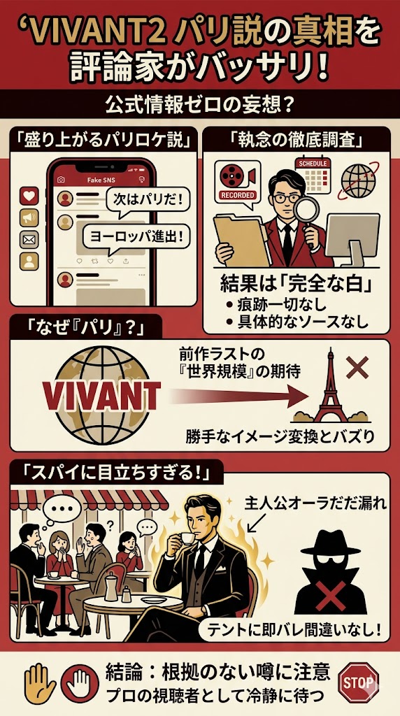 今、SNSや僕のブログのコメント欄で毎日狂ったように飛び交っているこの「VIVANT2 パリ・ロケ地説」。皆さんのその熱い気持ち、痛いほど分かります。僕だってパリで暗躍する別班を見たいですよ!