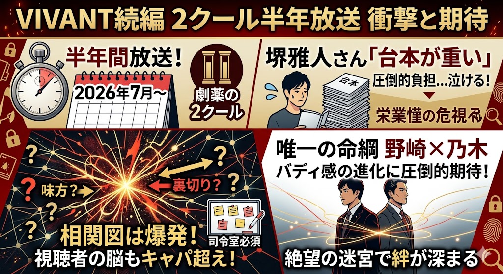 「2026年まで待てない!」と嘆く気持ちは痛いほど分かります。でも、この**「放送までの期間にあーだこーだ考察している時間」すら、VIVANTが僕らにくれた最高のエンタメ**なんです。