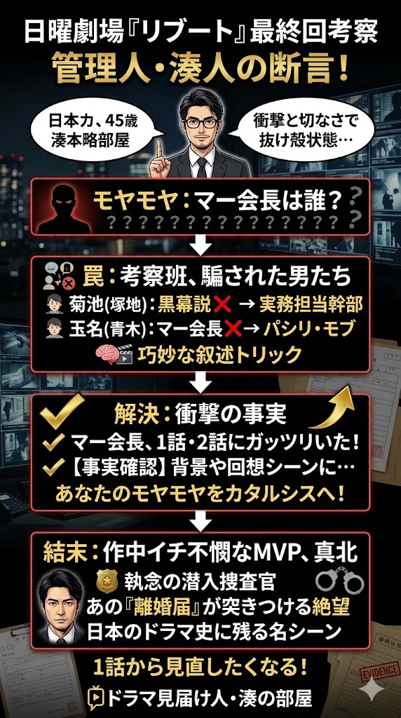いやぁ……真北への感情が爆発して、タイピングする手が震えています。マー会長の叙述トリックで脳を揺さぶられ、真北の理不尽すぎる結末に魂を抜かれる。僕たちは完全に『リブート』の掌の上で踊らされていましたね。次項では、なぜこのドラマがここまで僕たちを狂わせたのか、その真髄に迫ります!