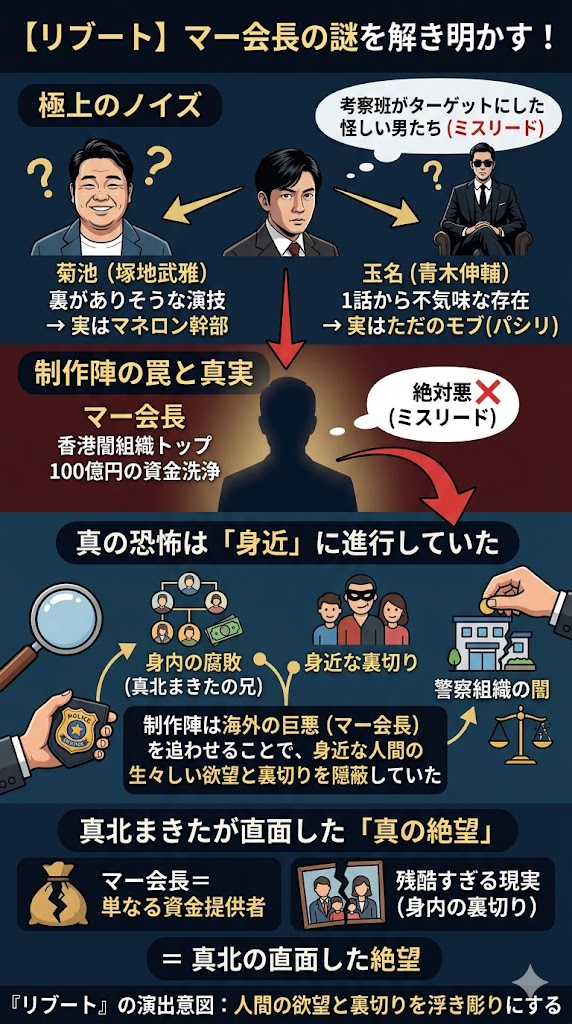 だからこそ、マー会長がただの「資金提供者」に過ぎなかったと分かった時の虚無感、そしてその後に襲いかかってくる真北の「残酷すぎる現実(身内の裏切り)」が、何倍もの威力を持って僕たちの心に突き刺さった。これこそが、『リブート』という作品が仕掛けた真の演出意図だったと、僕は確信しています。
