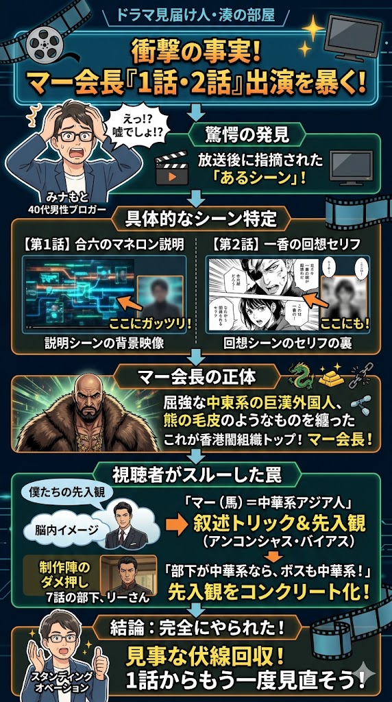「マー会長=絶対悪」という前提すらもが、僕たちを絶望の淵に突き落とすための壮大な前振りだった……。でも皆さん、驚くのはまだ早いです。実はその「架空の巨悪」と思われていたマー会長、信じられない形で第1話から僕たちの目の前に現れていたんです!次項、いよいよ驚愕の事実の全貌を明らかにします……!心して読んでください!