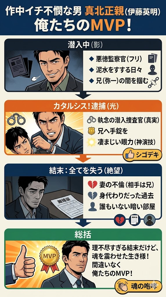 周囲から「腐った警察官」と蔑まれ、泥水をすするような思いで悪徳監察官の仮面を被り続けた日々。すべては、実の兄・弥一の闇献金の決定的な証拠を掴むため。そして、ついにその証拠を突きつけ、兄に手錠をかける瞬間の立ち振る舞い……!「真北、お前どんだけシゴデキなんだよ!!!」と、僕は深夜に一人、本気のスタンディングオベーションをしていました。