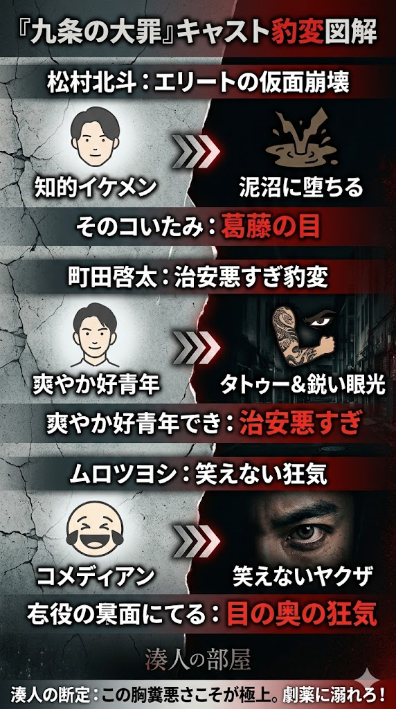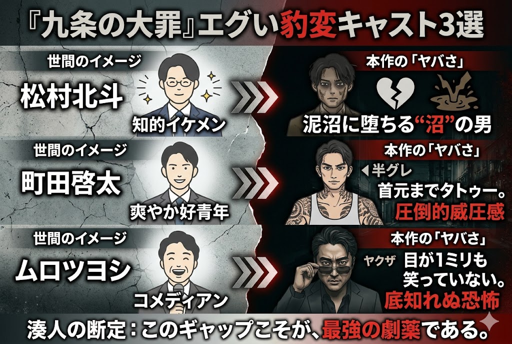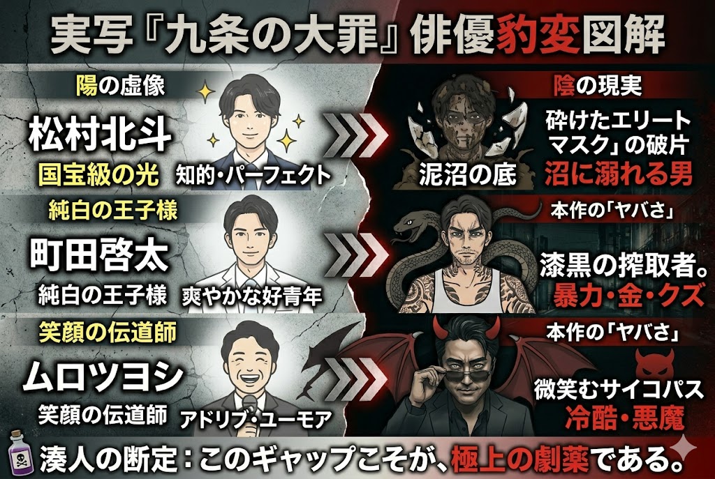 この記事では、普段のキラキラしたパブリックイメージをかなぐり捨て、底辺でもがく人間の業を見事に体現したキャストたちの「エグいギャップ」を、一人のドラマ狂としての全熱量と偏愛を込めて徹底解剖します。