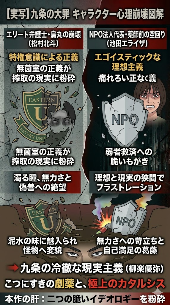 彼女は確かに弱者を救おうと必死にもがきます。しかし、その理想主義は時に痛々しく、自己満足や「正義の側にいたい」というエゴイズムすら孕んでいます。九条の理不尽なやり方にブチギレる彼女の姿は、圧倒的な悪意のシステムを前にして何もできない自分自身の無力さに対する、苛立ちの裏返しでもあるのです。