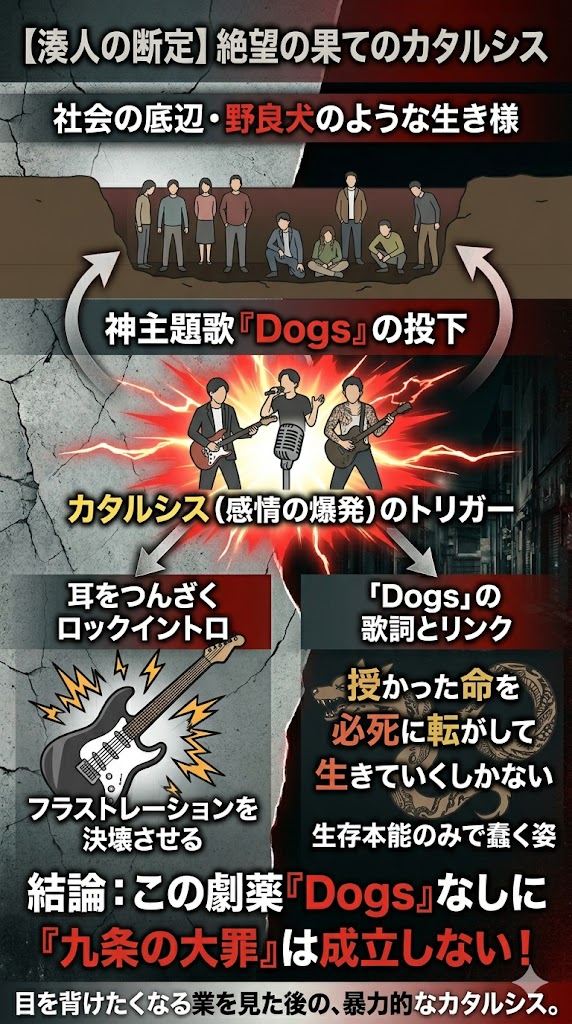 ドロドロの胸糞展開や、全く救いのないやるせない結末を迎えた各話のラスト。視聴者の心が最悪の形でどん底に叩き落とされ、言葉を失うその絶妙なタイミングで、『Dogs』の耳をつんざくような、エッジの効いた分厚いギターイントロが容赦なく切り込んできます。
