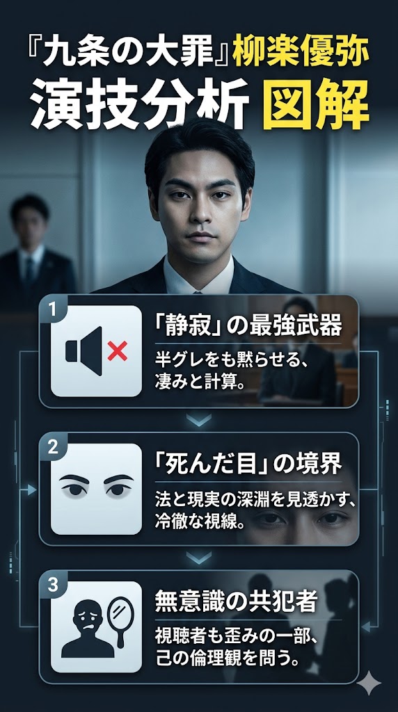 なぜ彼は声を荒らげず、慰めもしないのか? それは、感情を爆発させるよりも、静かに法を突きつける方が、相手を確実に、そして残酷に絶望の淵へ追い込めることを彼が理解しているからです。柳楽さんはこの「九条の冷徹な計算」を、もはや演技を超えた「肉体化された静寂」として具現化しています。