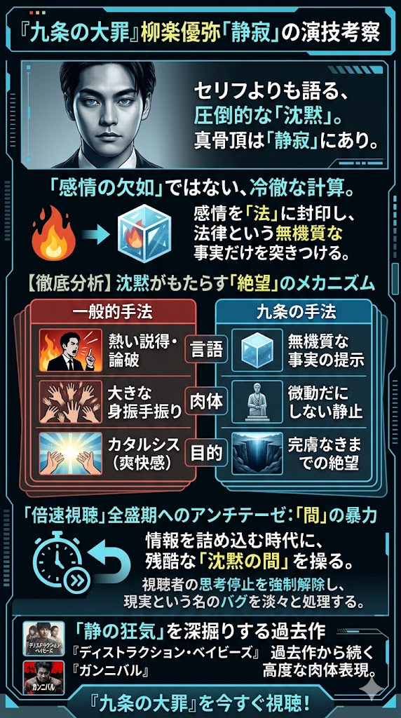 情報を詰め込み、結論を急ぐ「倍速視聴」全盛のこの時代。柳楽(やぎら)さんが操るあの「沈黙」は、視聴者に対する一種の暴力です。九条が黙り込む数秒間、僕たちは強制的に自分自身と向き合わされる。「この理不尽を許すのか?」「お前も加害者の一部ではないのか?」と。