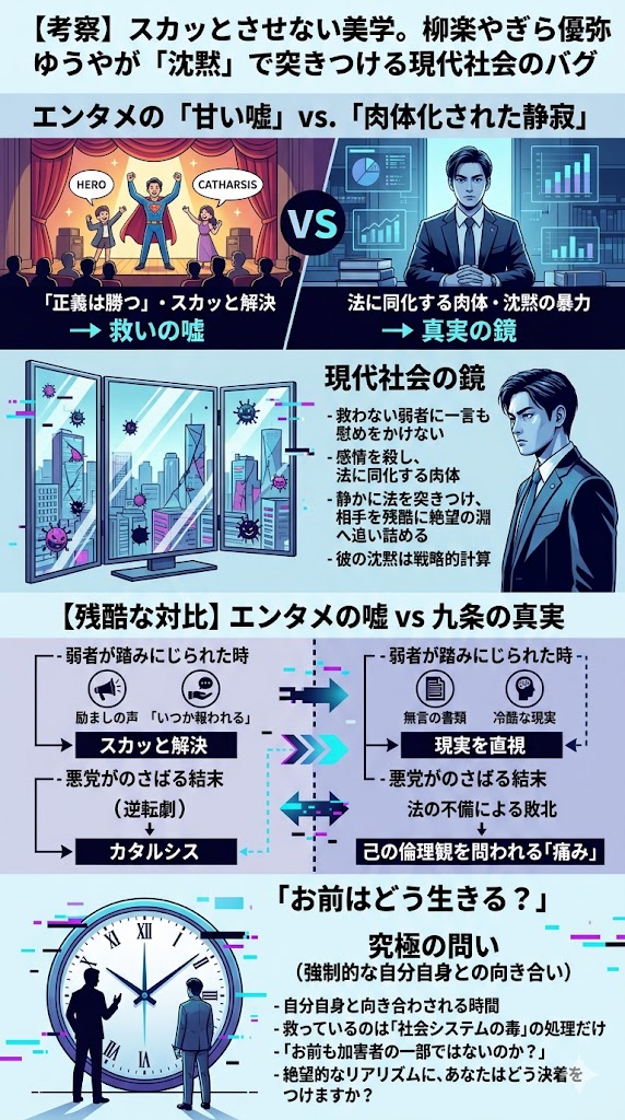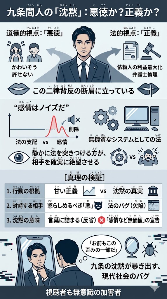 九条が語らない理由。それは、語れば語るほど「人間」としての体温が出てしまい、法の執行官としての純度が下がるからです。彼はあえて「冷徹な鏡」になることで、僕たちの偽善を映し出している。