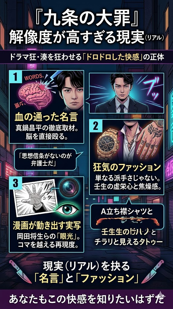 さて、この「解像度の高さ」が、物語の構造にどう関わっているのか。次章では、僕らの倫理観を完膚なきまでに叩き潰す『九条の大罪』の本質を、さらにディープに掘り下げていくぞ。準備はいいか?