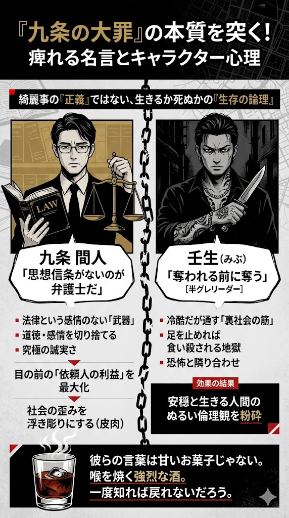 まず最初に、忠告しておきたい。ネット上に溢れる薄っぺらい「九条の大罪 名言まとめ」みたいなものを期待しているなら、他を当たってくれ。