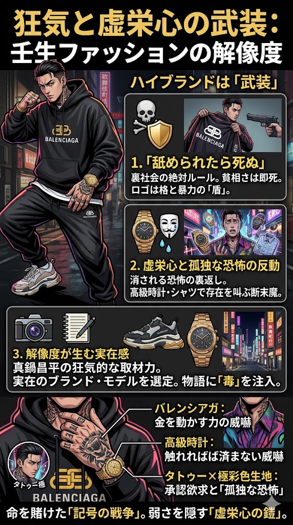 - ファッションの狂気: 単なる「派手な服」じゃない。壬生が着るハイブランドの選択一つに、半グレの「虚栄心」と「焦燥感」が詰まっている。