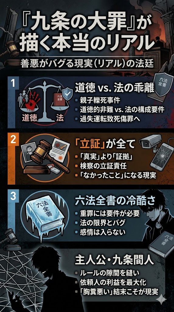 - 道徳と法の完全な乖離: 親子を轢き殺した青年。道徳的には万死に値するが、九条は「危険運転致死傷罪」ではなく、圧倒的に刑の軽い「過失運転致死傷罪」へ持ち込むためのシナリオを冷徹に構築する。