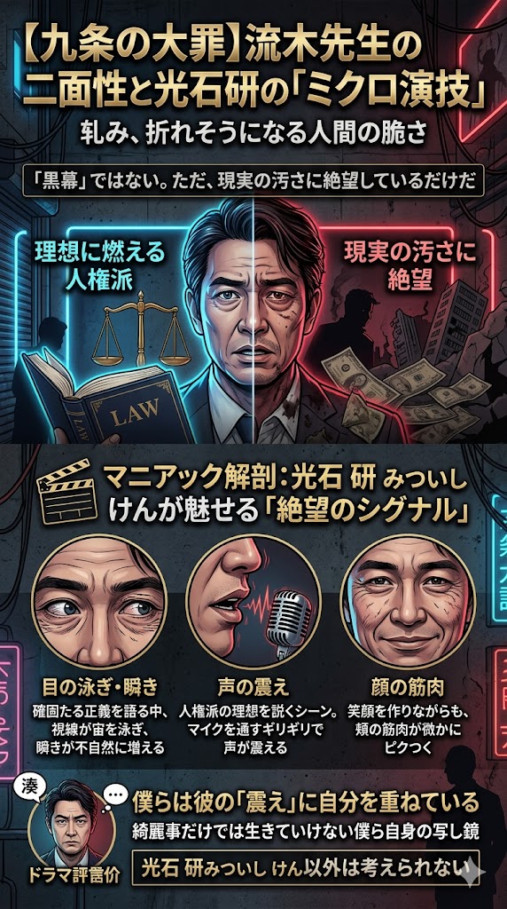 彼は心底「理想に燃える人権派」でありたいと願っている。しかし、九条たちが持ち込む、法で裁けない底なしに汚い現実を前に、その高い理想が音を立てて崩れそうになっているんです。その「自己矛盾」と「脆さ」こそが、彼の抱える本当の二面性なのです。