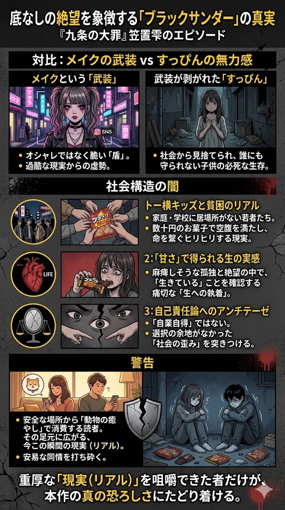 - 「甘さ」でしか得られない生の実感: 彼女たちにとって、ブラックサンダーの強烈な甘さは「おやつ」ではありません。麻痺しそうな絶望と孤独の中で、自分がまだ生きていることを確認するための、痛切な「生への執着」そのものです。