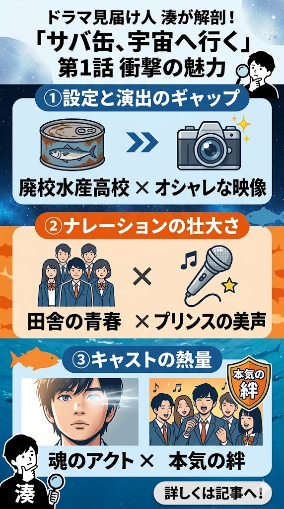 今回の第1話、確かに映像としては「美しい」でしょう。しかし、その美しさが『サバ缶、宇宙へ行く』という実話が持つ最大の武器、すなわち「泥臭さ」を殺してしまっている違和感を、皆さんは感じなかったでしょうか?