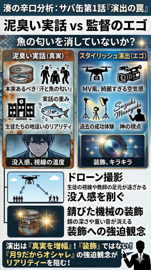 僕たちが観たいのは、地に足をつけて絶望と戦う新米教師の足元であり、生徒たちの冷え切った視線の温度です。スタイリッシュな映像は視聴者の視点を「神の視点」へと遠ざけ、当事者としての没入感を削いでしまっています。