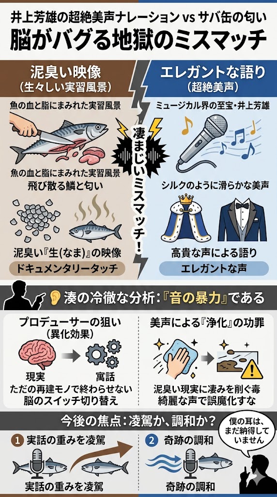 ドキュメンタリータッチの実話ベースドラマにおいて、ナレーションは映像の温度感に寄り添うのが鉄則。ですが、今回の演出陣はあえてそれを踏みにじった。サバの死骸が並ぶ調理場に、タキシード姿のプリンスが土足で踏み込んできたような、凄まじい違和感。この「ミスマッチ感」こそが、観る者の三半規管を激しく揺さぶるんです。