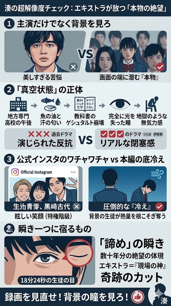 もしあなたが、主演の北村匠海さんの美しすぎる苦悩顔だけを追っているなら、今すぐ録画を見直すべきです。このドラマが「本物」である証明は、画面の端、ピントが合っていない背景の生徒たちの中にこそ隠されています。